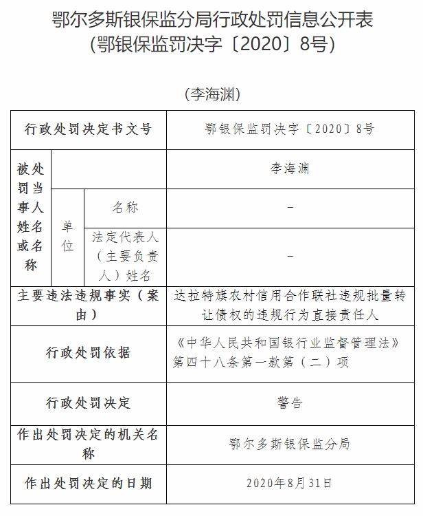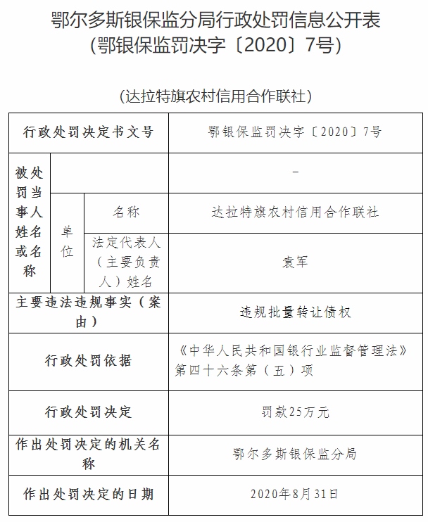 北疆新聞網(wǎng)、北疆新聞客戶端消息(記者 張楊)11月5日,銀保監(jiān)會官網(wǎng)通報達(dá)拉特旗農(nóng)村信用合作聯(lián)社違規(guī)批量轉(zhuǎn)讓債權(quán),被鄂爾多斯銀保監(jiān)分局依據(jù)《中華人民共和國銀行業(yè)監(jiān)督管理法》第四十六條第(五)項(xiàng),處以罰款25萬元。其法定代表人李海淵作為達(dá)拉特旗農(nóng)村信用合作聯(lián)社違規(guī)批量轉(zhuǎn)讓債權(quán)的違規(guī)行為直接責(zé)任人,被鄂爾多斯銀保監(jiān)分局依據(jù)《中華人民共和國銀行業(yè)監(jiān)督管理法》第四十八條第一款第(二)項(xiàng),處以警告處罰。