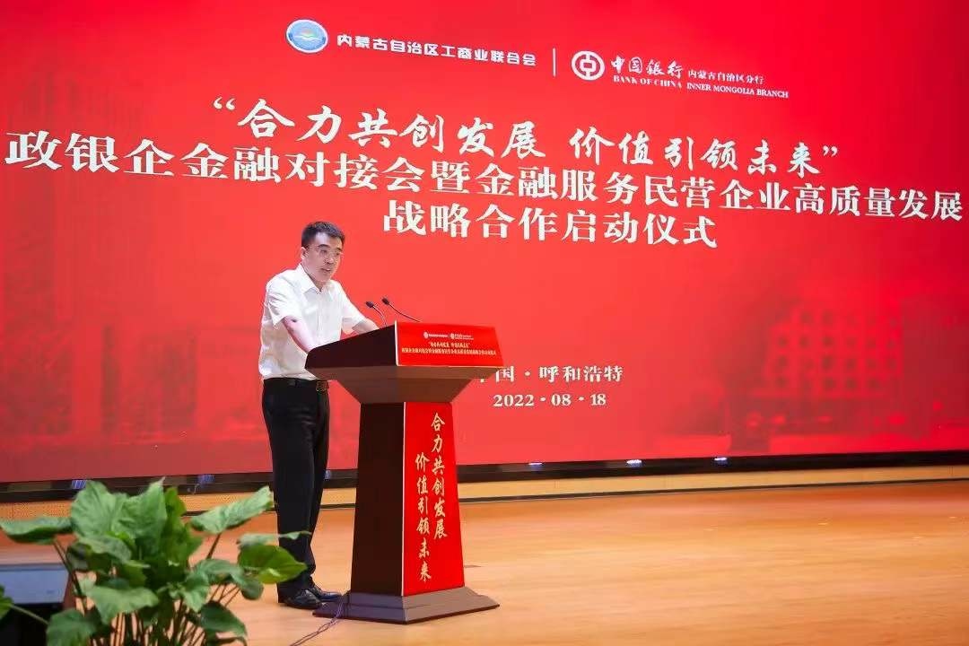 胡文勇在啟動儀式上表示,近年來,自治區(qū)工商聯(lián)積極踐行黨和政府聯(lián)系非公有制經(jīng)濟人士的橋梁紐帶職能,充分發(fā)揮統(tǒng)戰(zhàn)性、經(jīng)濟性、民間性綜合優(yōu)勢,緊緊圍繞自治區(qū)黨委、政府中心工作,團結(jié)和帶領(lǐng)廣大非公有制經(jīng)濟人士,與時俱進,大膽創(chuàng)新,努力實踐,不斷提高工商聯(lián)工作水平,引導(dǎo)民營企業(yè)堅定不移走以生態(tài)優(yōu)先、綠色發(fā)展為導(dǎo)向的高質(zhì)量發(fā)展新路子,推動優(yōu)化營商環(huán)境,促進我區(qū)非公有制經(jīng)濟又好又快發(fā)展,為全面建設(shè)小康社會、構(gòu)建和諧社會作出重要貢獻(xiàn)。作為唯一一家持續(xù)經(jīng)營超過百年的國有大行,中國銀行秉承“融通世界、造福社會”的崇高使命,將自身發(fā)展與地方經(jīng)濟發(fā)展緊密相連,主動擔(dān)當(dāng)服務(wù)支持民營企業(yè)發(fā)展壯大的金融重任。中國銀行內(nèi)蒙古分行將以此次簽約為契機,繼續(xù)深耕細(xì)作民營經(jīng)濟領(lǐng)域的融資服務(wù),在普惠金融、科技金融、綠色金融等領(lǐng)域加強金融支持,緩解小微企業(yè)“融資難、融資貴”問題,助企紓困,風(fēng)雨同舟,為深化政銀企合作共贏發(fā)展貢獻(xiàn)新力量。