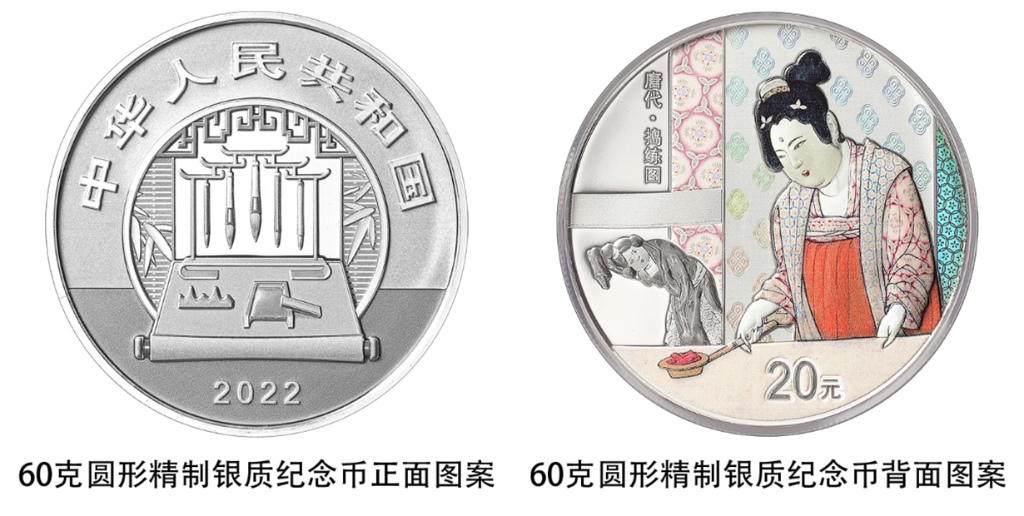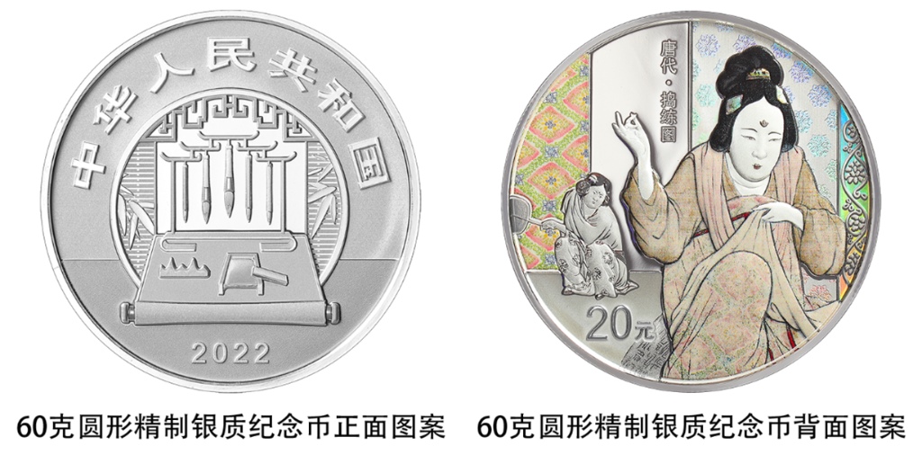 一枚60克圓形銀質(zhì)紀(jì)念幣背面圖案為《搗練圖》中扯練造型,襯以裝飾紋樣組合設(shè)計(jì),并刊“唐代·搗練圖”字樣及面額。