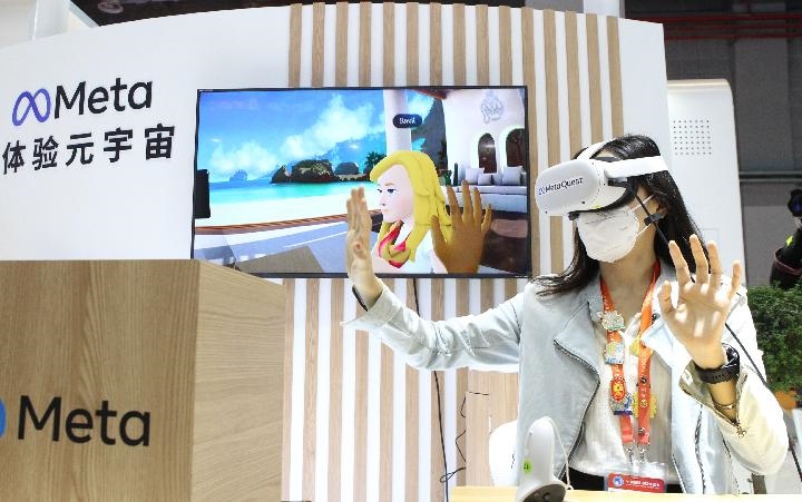 11月7日,在第五屆進(jìn)博會(huì)技術(shù)裝備展區(qū)的人工智能專區(qū),一名媒體工作人員借助VR頭戴設(shè)備體驗(yàn)虛擬工作空間“元宇宙”交互應(yīng)用。新華社記者 侯俊 攝