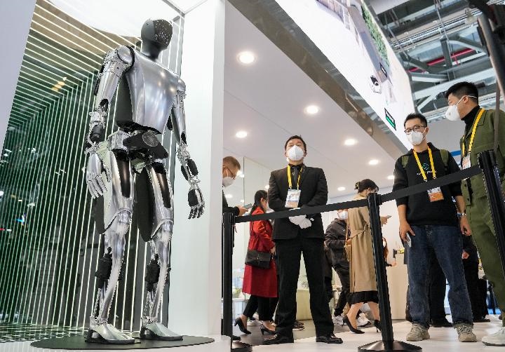 11月5日在第五屆進(jìn)博會(huì)汽車(chē)展區(qū)拍攝的特斯拉人形機(jī)器人。新華社記者 丁汀 攝