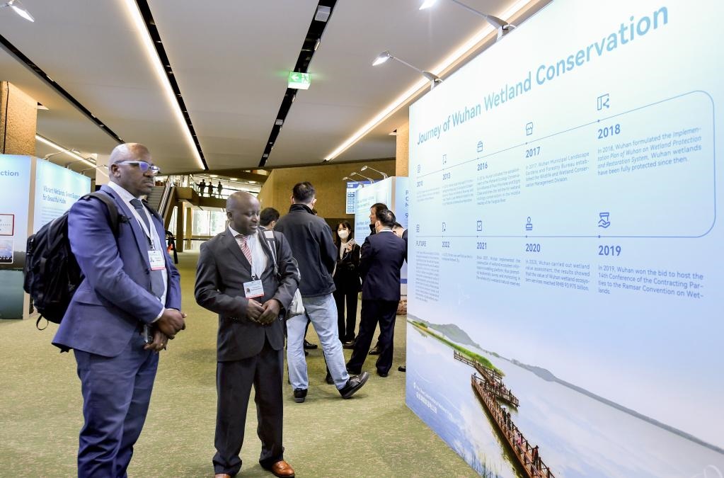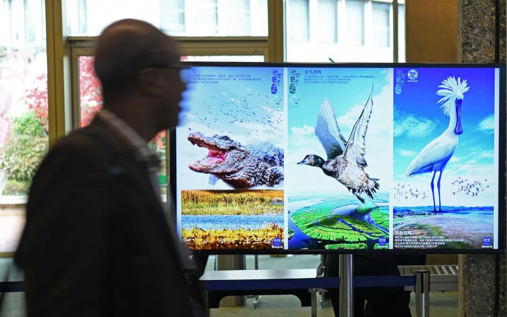 2022年11月5日,在瑞士日內(nèi)瓦,與會嘉賓在《濕地公約》第十四屆締約方大會日內(nèi)瓦會場中國展區(qū)參觀。新華社記者連漪攝