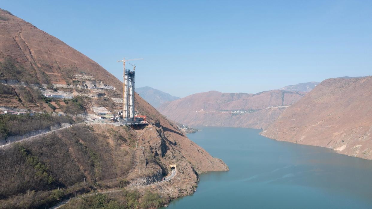 這是11月24日拍攝的川滇金沙江特大橋四川岸施工現(xiàn)場(無人機照片)。新華社記者 胥冰潔 攝