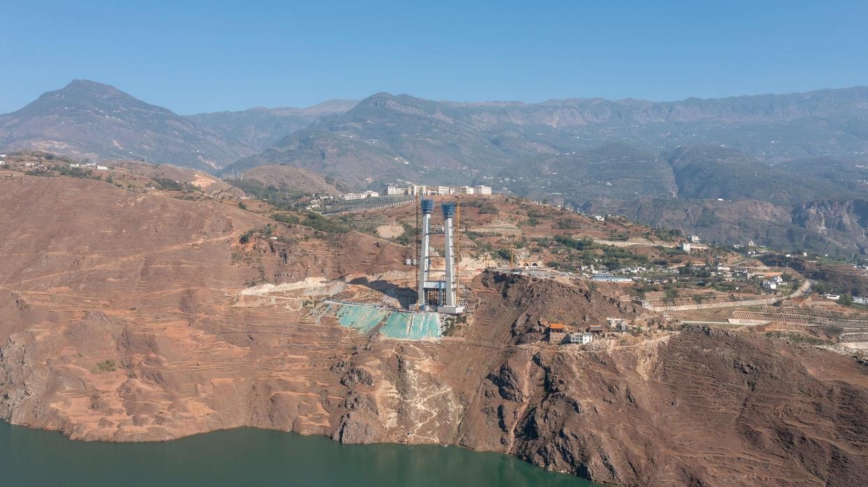 這是11月24日拍攝的川滇金沙江特大橋云南岸施工現(xiàn)場(無人機照片)。新華社記者 胥冰潔 攝