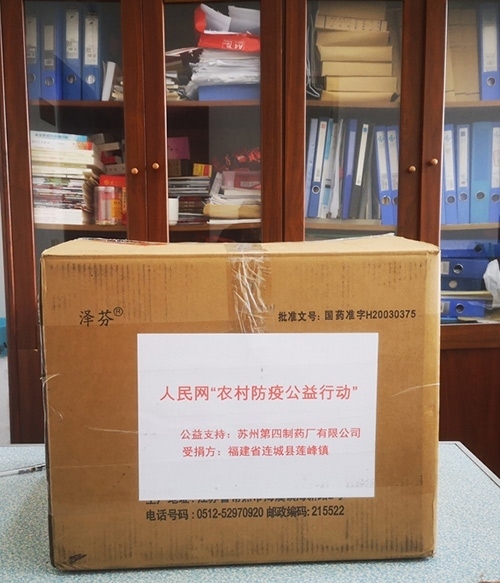 福建省連城縣蓮峰鎮(zhèn)收到蘇州第四制藥廠通過(guò)人民網(wǎng)“防疫互助平臺(tái)”捐贈(zèng)的右布洛芬膠囊。曾金水?dāng)z