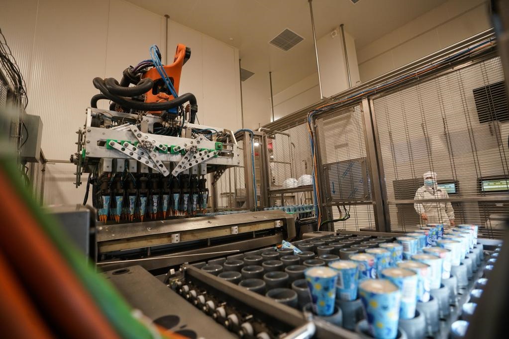 位于江蘇蘇州太倉的聯(lián)合利華和路雪生產基地,于2021年9月獲評全球“燈塔工廠”,成為當地“智能制造”的標桿。工廠里,機器人正將產品轉移到速凍隧道。新華社記者 季春鵬 攝
