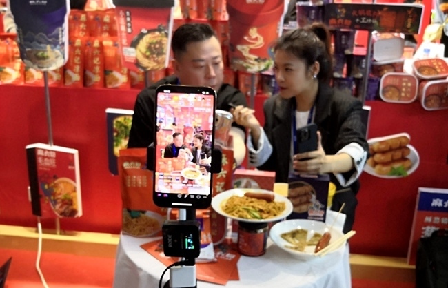 展館內(nèi)開啟了直播帶貨。人民網(wǎng)記者 孫博洋攝