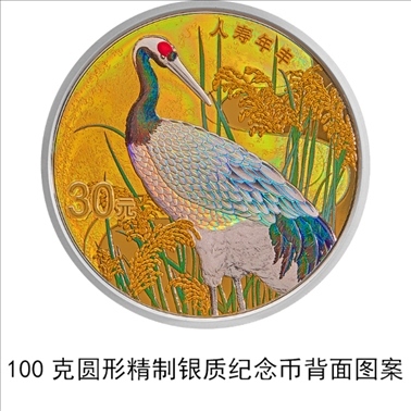 100克圓形銀質(zhì)“人壽年豐”紀(jì)念幣背面圖案為鶴、水稻等裝飾組合圖案,并刊“人壽年豐”字樣及面額。