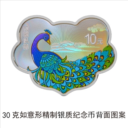 30克如意形銀質(zhì)“前程似錦”紀(jì)念幣背面圖案為孔雀、祥云裝飾組合圖案,并刊“前程似錦”字樣及面額。