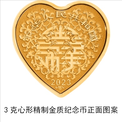 3克心形金質(zhì)紀(jì)念幣為精制幣,含純金3克,外接正方形邊長(zhǎng)18毫米,面額50元,成色99.9%,最大發(fā)行量20000枚。