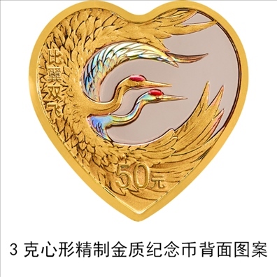 3克心形金質(zhì)“比翼雙飛”紀(jì)念幣背面圖案為雙鶴齊飛裝飾組合圖案,并刊“比翼雙飛”字樣及面額。