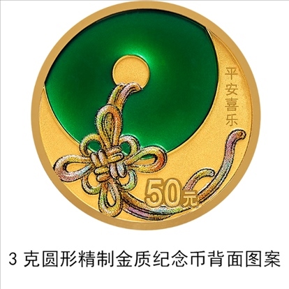 3克圓形金質(zhì)“平安喜樂”紀(jì)念幣背面圖案為平安扣、中國結(jié)裝飾組合圖案,并刊“平安喜樂”字樣及面額。