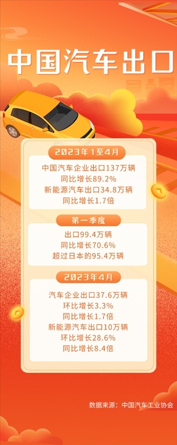 中國(guó)汽車(chē)工業(yè)協(xié)會(huì)的統(tǒng)計(jì)數(shù)據(jù)顯示,今年第一季度,國(guó)內(nèi)汽車(chē)企業(yè)出口99.4萬(wàn)輛,同比增長(zhǎng)70.6%,超過(guò)日本的95.4萬(wàn)輛。最新數(shù)據(jù)顯示,4月份,出口37.6萬(wàn)輛,同比增長(zhǎng)1.7倍,其中,電動(dòng)、混動(dòng)等新能源汽車(chē)出口10萬(wàn)輛,環(huán)比增長(zhǎng)28.6%,同比增長(zhǎng)8.4倍,保持良好勢(shì)頭。