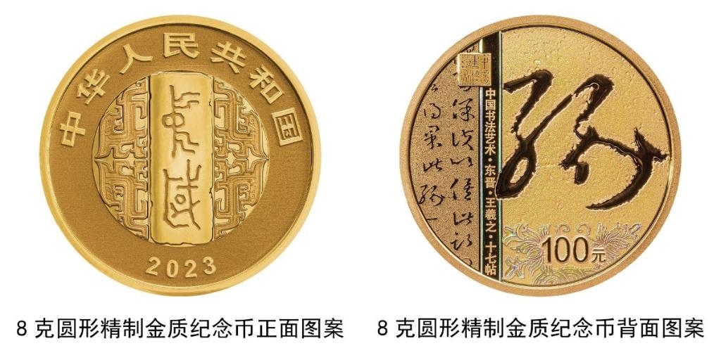 8克圓形金質(zhì)紀(jì)念幣背面圖案為東晉王羲之書《十七帖》局部文字及“緣”字樣與裝飾紋樣、“中國書法藝術(shù)”篆刻鈐印等組合設(shè)計,并刊“中國書法藝術(shù)·東晉·王羲之·十七帖”字樣及面額。