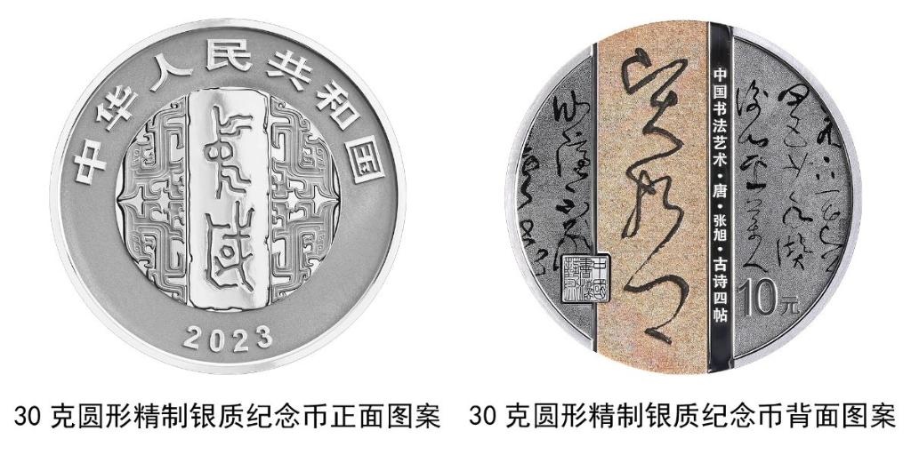 30克圓形銀質(zhì)紀(jì)念幣背面圖案為唐代張旭書《古詩四帖》局部文字及“賢哲”字樣與“中國書法藝術(shù)”篆刻鈐印等組合設(shè)計,并刊“中國書法藝術(shù)·唐·張旭·古詩四帖”字樣及面額。