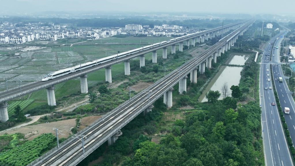 6月4日,從安徽省黃山市開往浙江省杭州市的列車從黃山北站駛出。新華社發(fā)(樊成柱 攝)