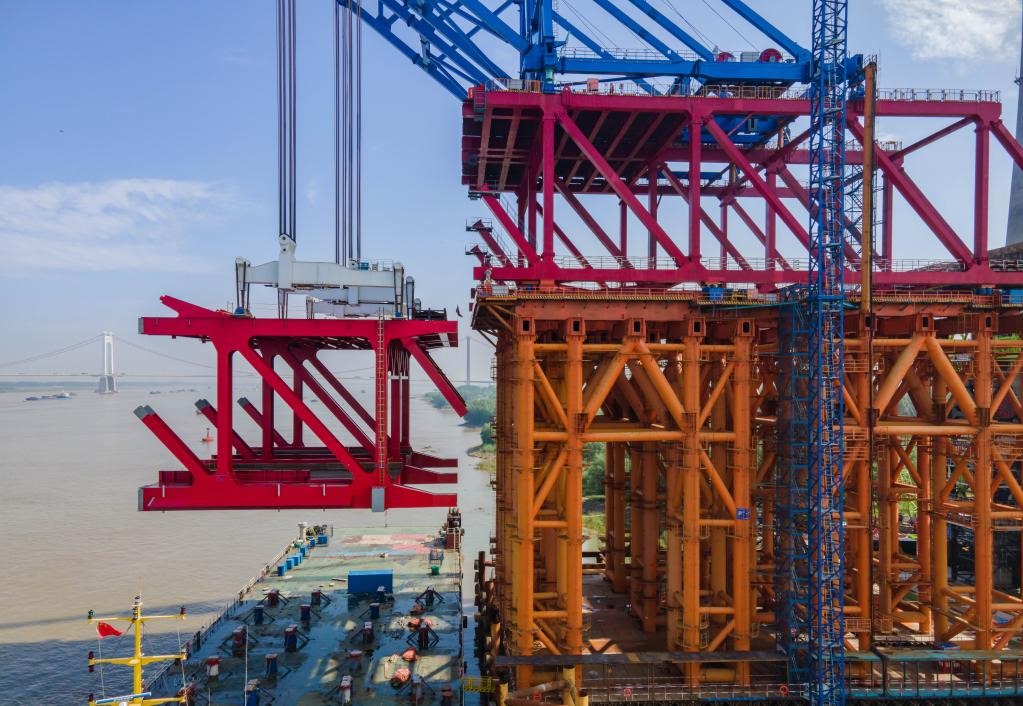5月28日,馬鞍山長江公鐵大橋正在進(jìn)行主汊航道橋南側(cè)首節(jié)段鋼桁梁吊裝(無人機(jī)照片)。新華社發(fā)(羅繼勝 攝)