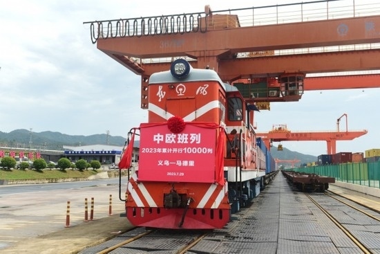 7月29日,隨著滿載110個標(biāo)箱出口貨物的X8020次中歐班列從鐵路義烏西站緩緩開出前往西班牙馬德里,2023年中歐班列累計(jì)開行已達(dá)1萬列,較去年提前22天破萬列;發(fā)送貨物108.3萬標(biāo)準(zhǔn)箱,同比增長27%。