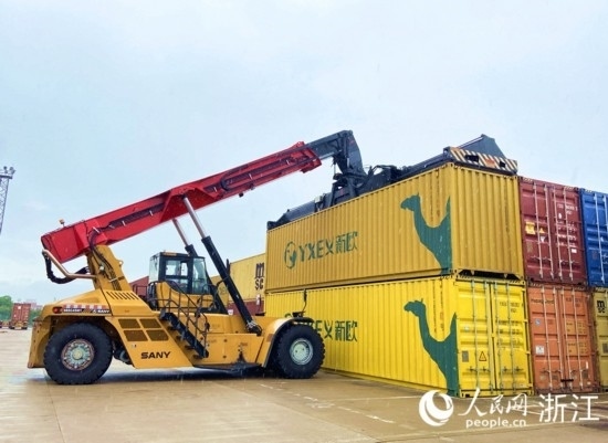 來到義烏鐵路口岸,往來車輛川流不息。繁忙運(yùn)作的堆場內(nèi),義烏市陸港鐵路口岸發(fā)展有限公司工作人員何江橋正操作一臺碩大的集裝箱正面吊,將一個個海關(guān)查驗(yàn)后的集裝箱送至龍門吊下,等待裝上即將發(fā)車的“義新歐”中歐班列。
