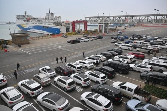 2024年1月26日,車輛在??谛潞8鄣却谴?。新華社記者 郭程 攝