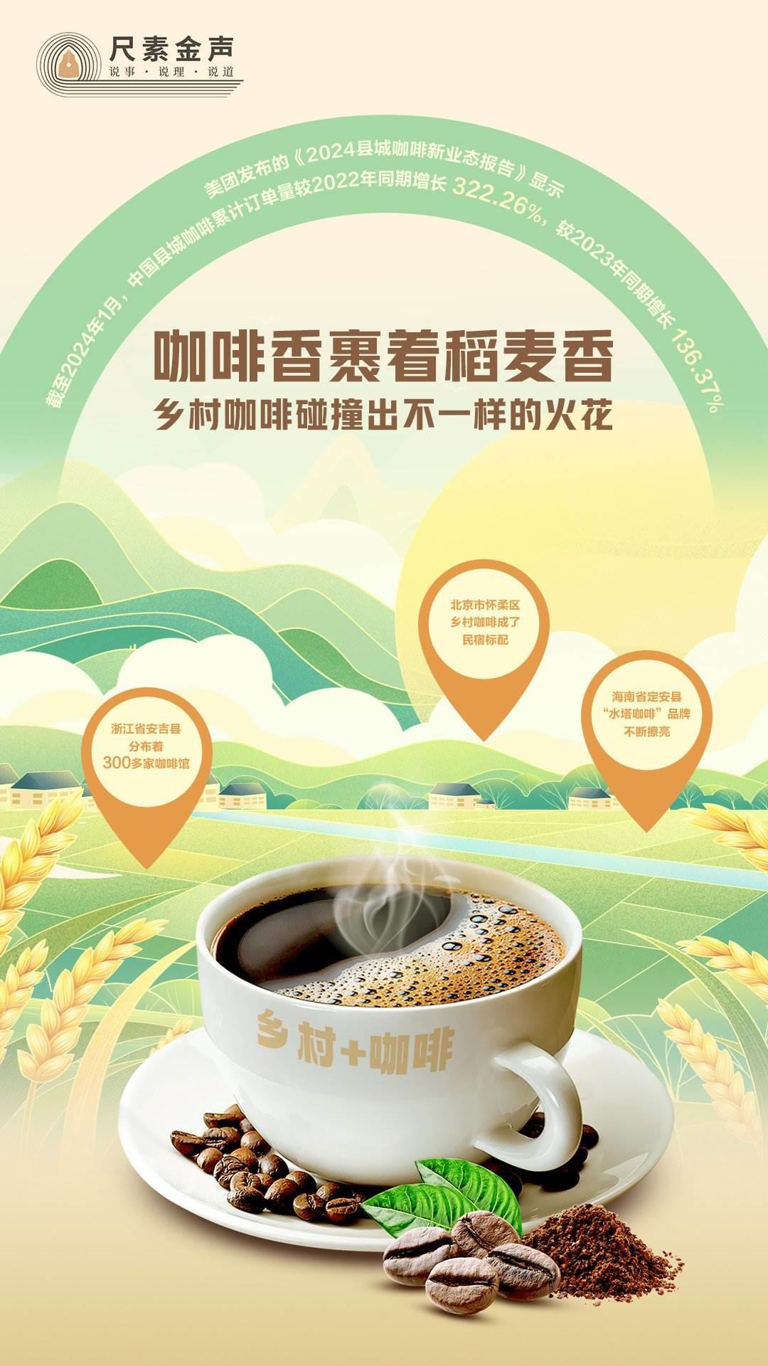 咖啡香裹著稻麥香,吹遍田野?!翱Х?”成為鄉(xiāng)村旅游新業(yè)態(tài)。美團(tuán)發(fā)布的《2024縣城咖啡新業(yè)態(tài)報(bào)告》顯示,截至2024年1月,中國(guó)縣城咖啡累計(jì)訂單量較2022年同期增長(zhǎng)322.26%,較2023年同期增長(zhǎng)136.37%。鄉(xiāng)村咖啡火出圈,背后靠什么?