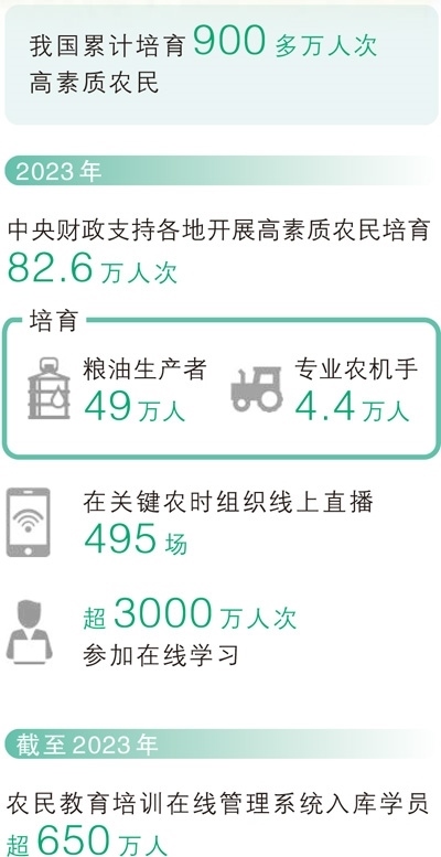 目前,我國累計培育900多萬人次高素質農民。嘗鮮新技術、涉足新業(yè)態(tài),一批批高素質農民積極擁抱專業(yè)化、規(guī)模化、標準化的現(xiàn)代經(jīng)營理念,為農業(yè)農村發(fā)展保持穩(wěn)中向好態(tài)勢提供了有力支撐。