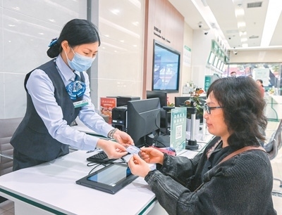 “社保服務(wù)事項進銀行”是重慶市社會保險局創(chuàng)新推出的一項公益服務(wù),合作銀行通過所有人工服務(wù)網(wǎng)點、智能自助服務(wù)終端以及手機銀行App,向群眾免費提供社保服務(wù)。圖為中國農(nóng)業(yè)銀行重慶沙坪壩天星橋支行,工作人員為市民辦理相關(guān)社保業(yè)務(wù)。孫凱芳攝(人民視覺)