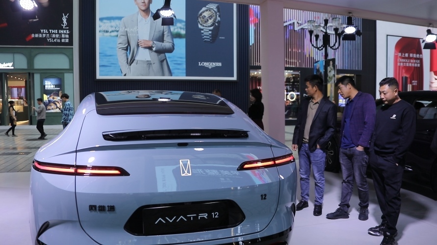 新上市的新能源汽車長(zhǎng)安阿維塔12雙動(dòng)力車型吸引往來游客。新華社記者趙小帥 攝