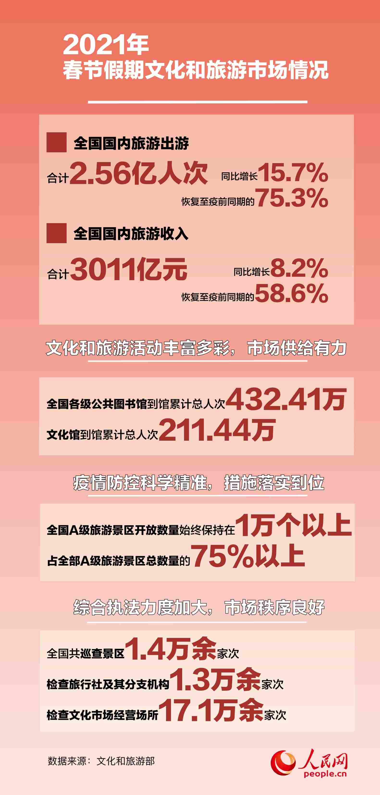 人民網北京2月25日電 (白帆)2月25日,文化和旅游部發(fā)布了2021年春節(jié)假期文化和旅游市場情況。數(shù)據顯示,綜合各地文化和旅游部門、通訊運營商、線上旅行服務商的數(shù)據,經文化和旅游部數(shù)據中心測算,春節(jié)假期七天,全國國內旅游出游合計2.56億人次,同比增長15.7%,恢復至疫前同期的75.3%。實現(xiàn)國內旅游收入3011億元,同比增長8.2%,恢復至疫前同期的58.6%。