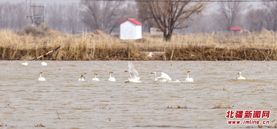 3月11日,天鵝在黃河呼和浩特托克托縣段附近水域游弋。近日,隨著北方氣溫逐漸回升,黃河托克托縣段冰河加速開河。 樂炎攝影報道