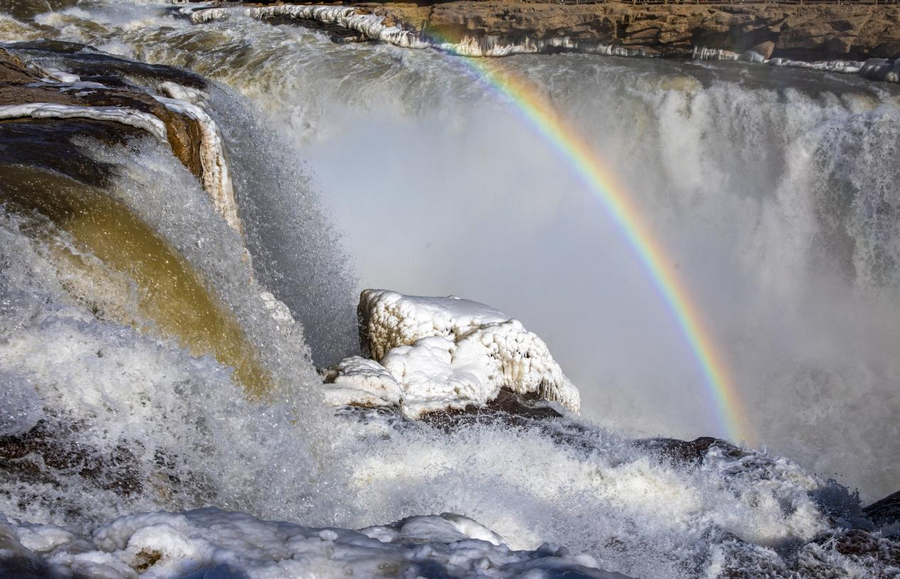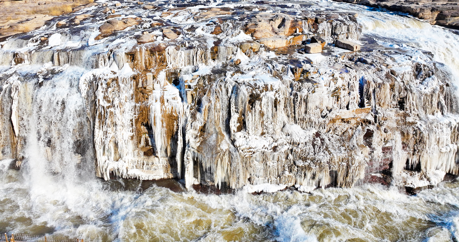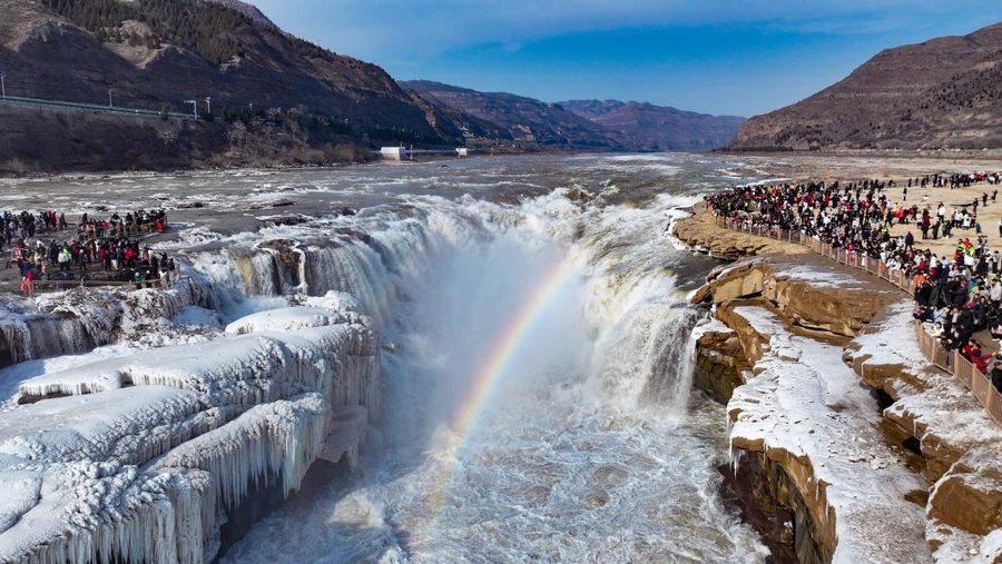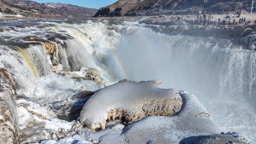 2月6日,受近日持續(xù)降溫天氣影響,位于秦晉大峽谷的陜西壺口瀑布景區(qū)出現(xiàn)冰瀑玉壺景觀。從空中俯瞰,滔滔黃河水奔騰咆哮,場(chǎng)面蔚為壯觀,飛濺起的浪花和彌漫的水霧在兩岸巖石和護(hù)欄上迅速凝結(jié),形成形狀各異的冰掛,晶瑩剔透,美不勝收,飛瀑上空偶現(xiàn)的彩虹與冰掛同框,交相輝映。由于近期黃河水流量上漲,達(dá)到700立方米每秒,景區(qū)主側(cè)瀑布攜手傾瀉,呈現(xiàn)“90版50元人民幣”上的壯美瀑布景觀,游客一次旅程可觀看雙瀑奇觀。