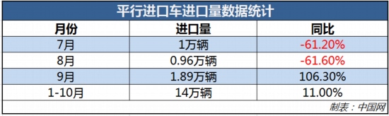 除了新能源汽車進(jìn)口量增長,平行進(jìn)口車也成為了一大亮點(diǎn)。根據(jù)數(shù)據(jù)顯示,今年7、8月份,我國平行進(jìn)口車在進(jìn)口車市場中成績還屬較差。其中,7月份平行進(jìn)口車進(jìn)口量約為1萬輛,同比下滑了61.2%;8月份平行進(jìn)口車進(jìn)口量也不理想,僅有9600輛,同比下滑了61.6%。但就在9月份,平行進(jìn)口車數(shù)量則出現(xiàn)了大幅攀升。根據(jù)國機(jī)汽車數(shù)據(jù)統(tǒng)計,9月份我國平行進(jìn)口汽車進(jìn)口量約為1.89萬輛,同比大增106.3%。今年1-10月,平行進(jìn)口車數(shù)量共14.0萬輛,同比上漲了11.0%,占進(jìn)口總量的16%。詳情見下表: