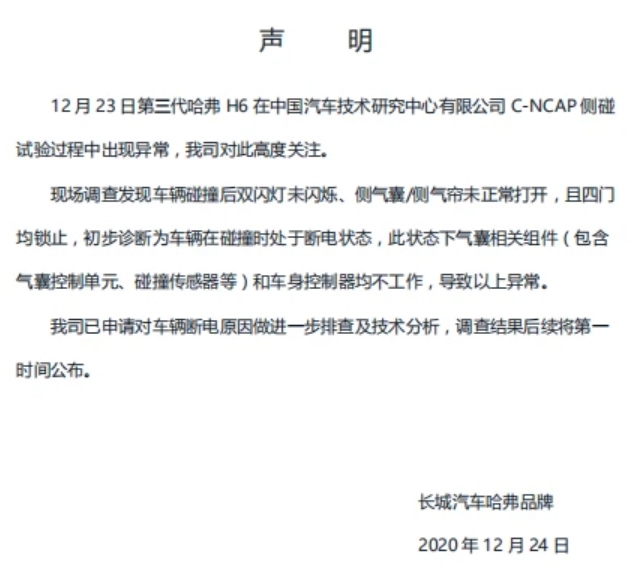 針對此碰撞結果,長城汽車給出了官方聲明,稱初步診斷為車輛在碰撞時處于斷電狀態(tài),導致以上異常。具體內容如下: