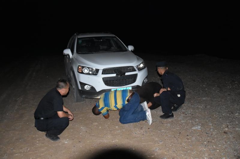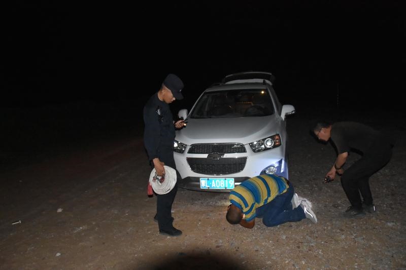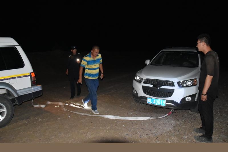 正當(dāng)二人漸漸失去希望的時候,當(dāng)晚10點10分,遠(yuǎn)處一道燈光閃過,原來,阿拉善邊境管理支隊溫圖高勒邊境派出所民警下鄉(xiāng)走訪正好路過。得知二人情況后,民警立即展開救援,一路迅速找出隨身攜帶的干糧、礦泉水為二人補充體力,一路找出牽引繩對被困車輛開展救援,經(jīng)過6個小時的拖拽,終于在凌晨4點將兩名群眾安全帶到了派出所。