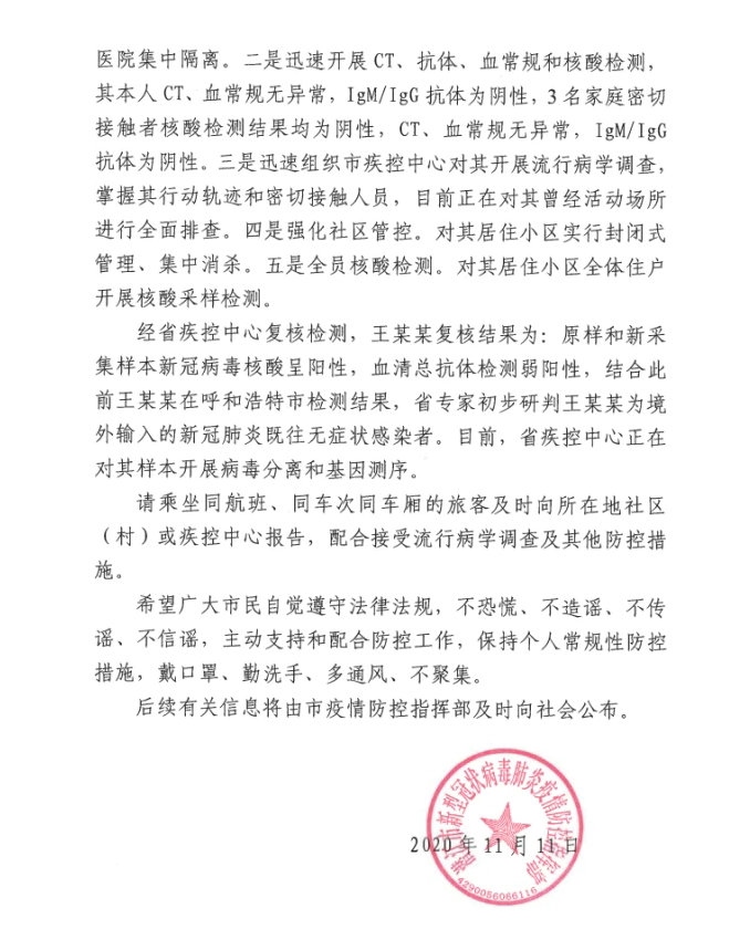王某,男,于2020年10月17日從哈薩克斯坦阿克托別市經(jīng)白俄羅斯明斯克州乘坐CA722航班抵達(dá)呼和浩特市。10月17日至31日在呼和浩特市境外入呼人員集中隔離酒店單人單間集中隔離,10月17日經(jīng)呼和浩特海關(guān)核酸檢測(咽拭子)陰性,31日經(jīng)呼和浩特市疾控中心核酸檢測(咽鼻混合拭子)陰性。11月1日王某集中隔離期滿,乘坐專用大巴至白塔機(jī)場,經(jīng)機(jī)場專用通道乘坐ZH9128航班抵達(dá)武漢天河機(jī)場后,乘地鐵、動車、私家車返回潛江市家中。王某在呼集中隔離期間,嚴(yán)格按照《新型冠狀病毒肺炎防控方案(第七版)》及入境人員管理要求落實(shí)了管控措施。