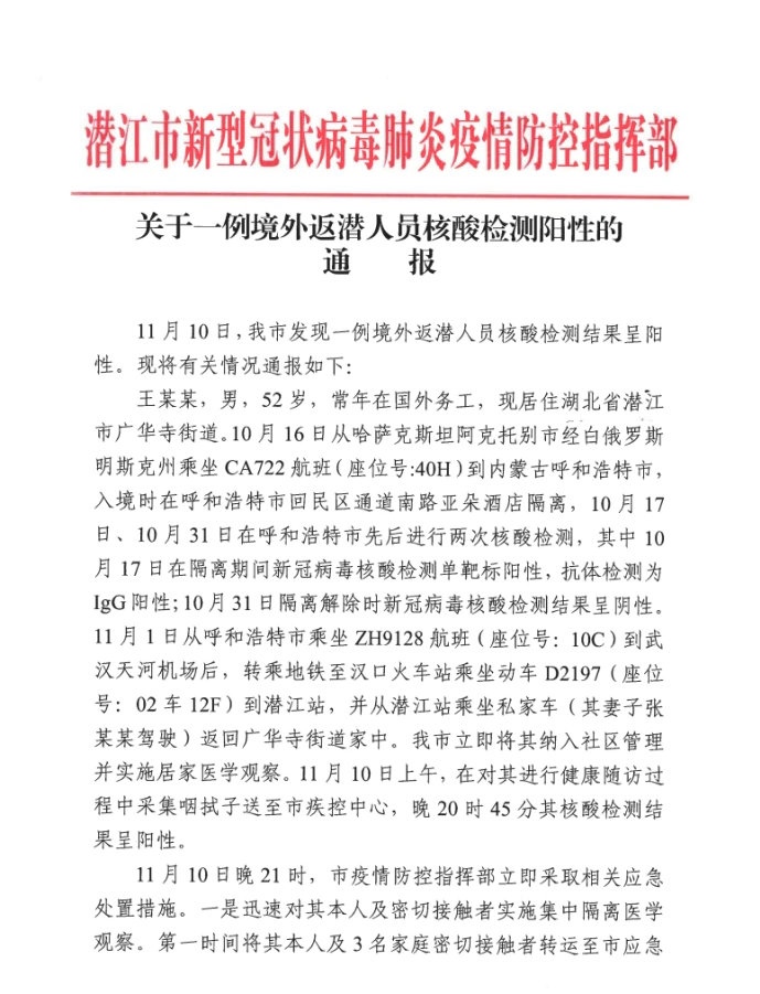 2020年11月11日,網(wǎng)絡(luò)多家媒體轉(zhuǎn)載湖北省潛江市新冠肺炎防控指揮部發(fā)布的題為“關(guān)于一例境外入潛人員核酸檢測陽性的通報(bào)”,內(nèi)容涉及一名入境人員在呼和浩特市集中隔離醫(yī)學(xué)觀察后返鄂后被診斷為新冠肺炎無癥狀感染者相關(guān)內(nèi)容。經(jīng)核查,相關(guān)情況公告如下: