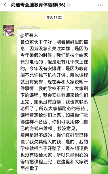 根據(jù)謝女士提供的轉(zhuǎn)賬證明和聊天截圖記者注意到,“尚道奇全腦教育體驗(yàn)群”1月15日發(fā)布的一則通知稱,今年暑假,機(jī)構(gòu)老師曾挨個(gè)給家長(zhǎng)打電話通知上課,但是沒(méi)有幾個(gè)來(lái)上課的,加上教育局不允許線下機(jī)構(gòu)開(kāi)課,所以課程遲遲沒(méi)有安排。并稱學(xué)校賠錢(qián)了,沒(méi)有錢(qián)退給大家,只能耐心等待疫情結(jié)束后安排上課,如果家長(zhǎng)覺(jué)得不合適,可以用自己的方式維權(quán)。“她的說(shuō)辭明顯前后矛盾,暑假期間說(shuō)課件損毀,現(xiàn)在又說(shuō)沒(méi)學(xué)生上課。”謝女士氣憤地說(shuō),和她遭遇同樣情況的還有30多名家長(zhǎng),399元雖然不是大數(shù)目,但這樣欺騙大家實(shí)屬不該。