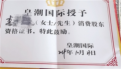 皇潮醫(yī)療美容為李女士頒發(fā)的消費股東資格證書