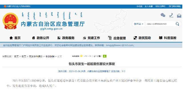 北疆新聞網(wǎng)、北疆新聞客戶端消息(記者 李艷紅)記者從內蒙古自治區(qū)應急管理廳獲悉,3月5日13時40分許,包頭市南通道恒建設工程有限公司在稀土高新技術產(chǎn)業(yè)開發(fā)區(qū)伊泰華府薈一期項目工地安裝電梯過程中,發(fā)生一起重傷害事故,造成3人死亡。據(jù)了解,死亡原因可能為員工操作不當造成。