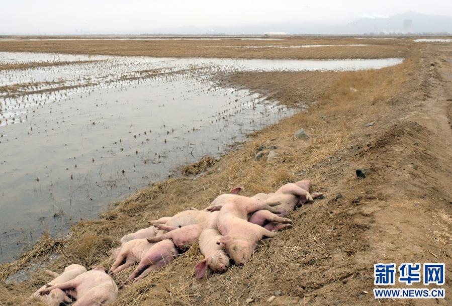 這是3月20日在達(dá)拉特旗黃河國堤內(nèi)拍攝的死豬。新華社記者 賈立君 攝