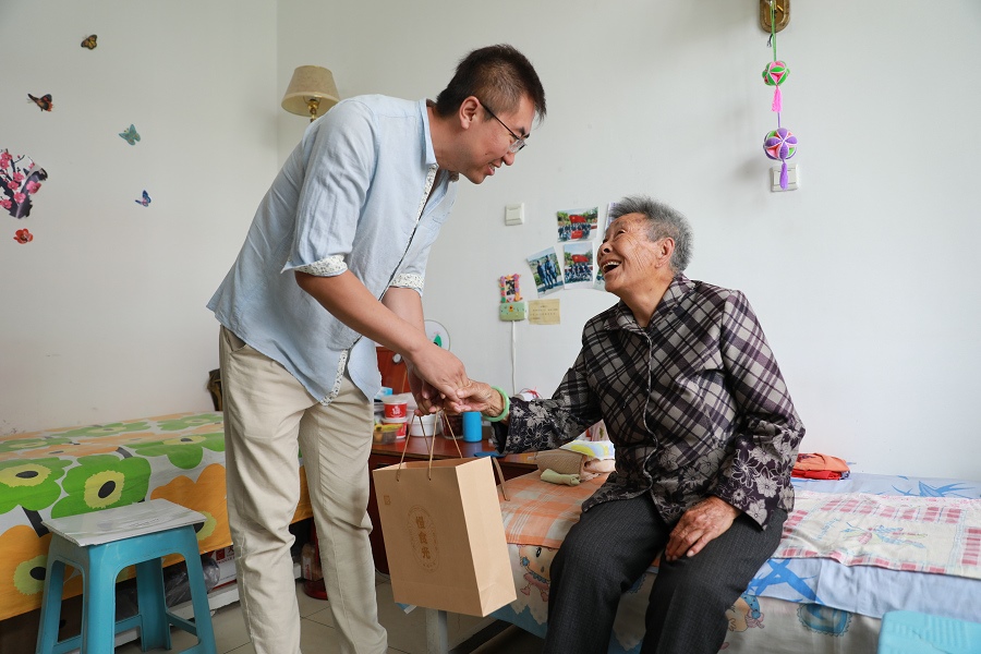 中午時(shí)分,捐贈(zèng)代表來(lái)到位于呼市金山開(kāi)發(fā)區(qū)的??道夏旯ⅰT诟?道夏旯⒗钣懒猎洪L(zhǎng)的帶領(lǐng)下,安德?tīng)柕茸哌M(jìn)公寓樓,將愛(ài)心月餅送到老人的手里。