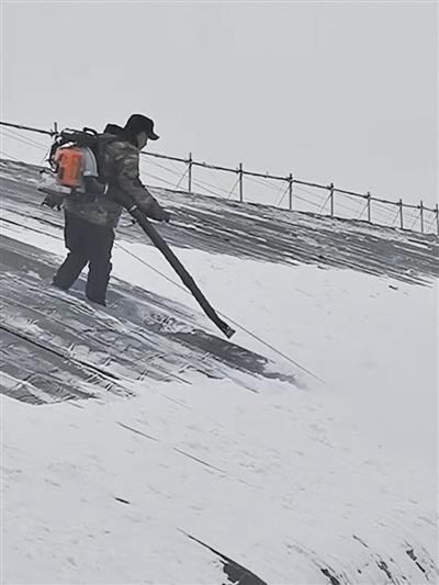 為防止出現(xiàn)垮塌危險(xiǎn),紅星街道干部手持吹雪機(jī)上陣,保障大棚種植戶農(nóng)業(yè)生產(chǎn)安全。
