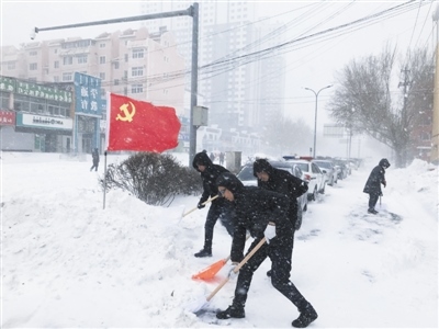 鐵路街道黨員干部充分發(fā)揮先鋒模范帶動作用,在黨旗的引領(lǐng)下,齊心協(xié)力除冰除雪。