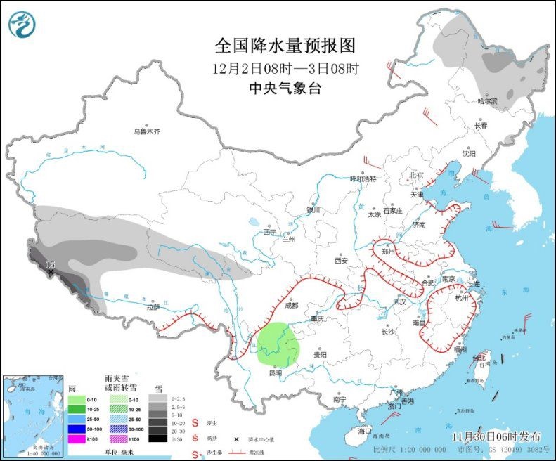 11月30日08時至12月1日08時,內(nèi)蒙古東部、東北地區(qū)東部等地部分地區(qū)有小到中雪,其中,遼寧東北部、吉林東部、黑龍江東部等地有大到暴雪,其中,黑龍江東南部和東部局地有大暴雪(20~29毫米)。西南地區(qū)南部、臺灣島大部等地部分地區(qū)有小雨。華北、東北地區(qū)南部、黃淮、江淮、江南東部等地有4~5級偏北風,陣風6~8級;我國東部和南部海域?qū)⒂?~9級風,陣風10~11級。