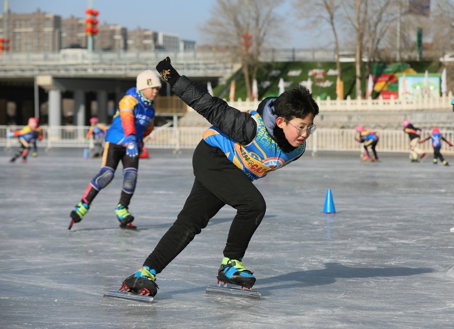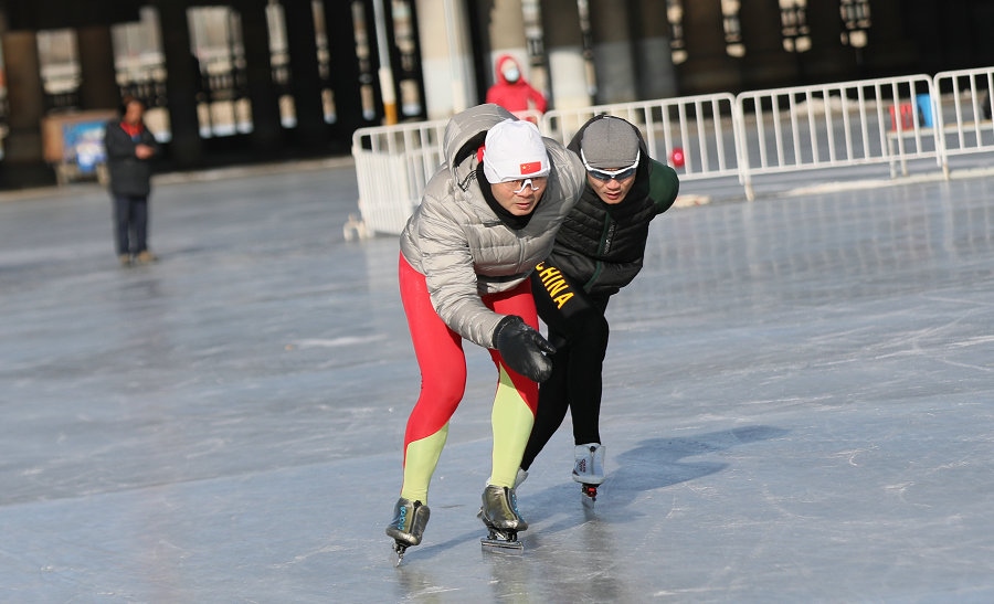 冰雪愛(ài)好者在東河冰雪場(chǎng)滑冰