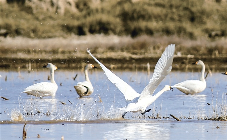 托克托縣黃河濕地管護中心副主任王曉東接受記者采訪時表示,黃河流經(jīng)托克托縣37.5公里、9個自然村。隨著近年來對黃河流域生態(tài)環(huán)境保護力度的加大,每年都會吸引大批鳥類來托克托縣“做客”,其中尤以天鵝最受關注。天鵝屬于國家二級保護鳥類,每年從2月底3月初開始,就會成群結(jié)隊來黃河流域一帶停歇、棲息、覓食,補充能量后,再繼續(xù)飛行,最多的時候有上萬只。(記者 張巧珍 牛天甲)