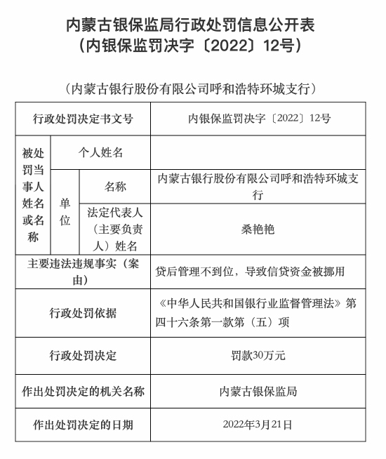 4月28日消息,據(jù)內(nèi)蒙古銀保監(jiān)局行政處罰信息公開表顯示,內(nèi)蒙古銀行股份有限公司呼和浩特環(huán)城支行因貸后管理不到位導(dǎo)致信貸資金被挪,被罰款30萬元。具體內(nèi)容如下: