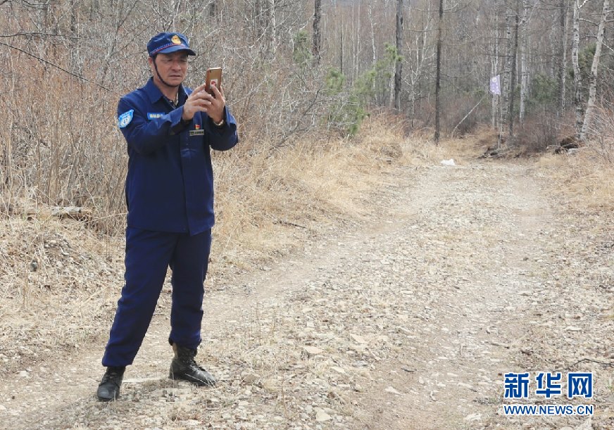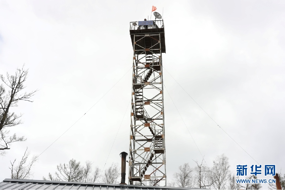5月11日,57歲的森防瞭望員周桂波站在22米高的瞭望塔上,穿著棉襖棉褲頂著寒風(fēng)瞭望、匯報、記錄。新華網(wǎng)發(fā)(欒維敬 攝)