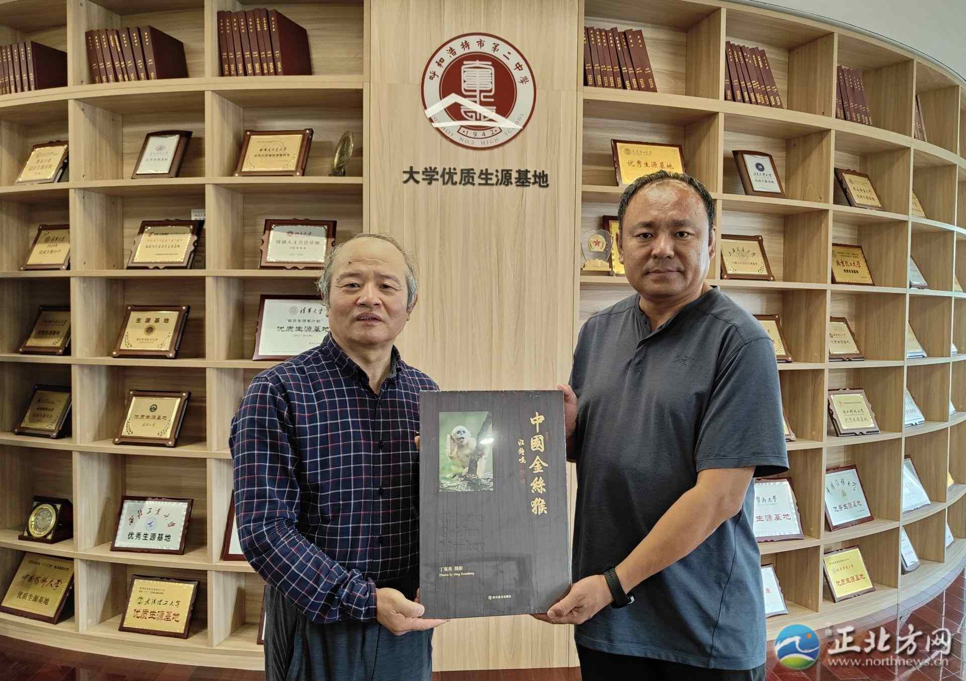 丁寬亮(左)將《中國金絲猴》捐贈(zèng)呼和浩特市第二中學(xué)