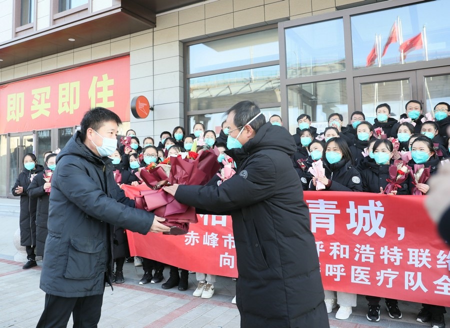 新華融媒、北疆新聞網消息(記者 張楊)“自呼和浩特疫情發(fā)生以來,50多個晝夜,白衣天使們逆行參戰(zhàn),奮戰(zhàn)在抗疫第一線,為呼和浩特保衛(wèi)戰(zhàn)貢獻了自己的力量,體現(xiàn)了白衣天使的責任和擔當,更展現(xiàn)了赤峰人奮勇拼搏的精神,圓滿完成了援呼醫(yī)療各項任務,沒有辜負家鄉(xiāng)人民的重托,大家辛苦啦!”12月5日,在赤峰援呼普通病區(qū)醫(yī)療隊圓滿完成各項任務,即將凱旋之際,赤峰市人民政府駐呼和浩特聯(lián)絡處和內蒙古赤峰商會,共同到醫(yī)療隊駐地看望醫(yī)療隊員。赤峰市人民政府駐呼和浩特聯(lián)絡處副主任李子輝,代表駐呼聯(lián)絡處和內蒙古赤峰商會在呼和浩特地區(qū)鄉(xiāng)友,向援呼醫(yī)療隊領隊羅俊祥等醫(yī)護人員獻上鮮花和對家鄉(xiāng)同胞的親切問候。